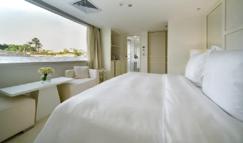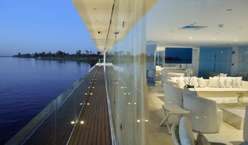 Durante il viaggio, avrai il privilegio di ammirare scenari straordinari direttamente dalla tua cabina con vista sul fiume, lasciandoti conquistare dalla bellezza di paesaggi che cambiano lentamente tra rive dorate, templi maestosi e villaggi dal fascino senza tempo. A bordo, il design elegante si unisce a un servizio attento e discreto, creando un perfetto equilibrio tra relax, privacy e charme. Ogni giornata regala emozioni speciali: pranzi raffinati, cene suggestive, tramonti spettacolari e serate che celebrano la cultura egiziana con musica, danze e atmosfere coinvolgenti.