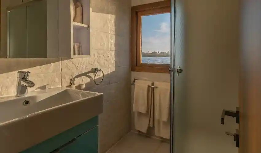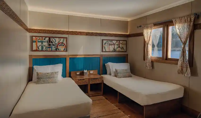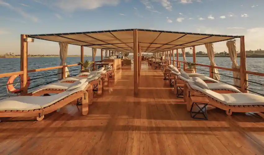 La Dahabeya Nuun è progettata per offrire un viaggio intimo e rilassante, lontano dalle rotte più affollate delle grandi navi da crociera. Con le sue eleganti vele e i suoi spazi curati nei minimi dettagli, la barca ricrea il fascino della navigazione tradizionale sul Nilo, arricchito da servizi moderni e da un’ospitalità attenta e calorosa. Sul ponte panoramico potrai rilassarti, ammirare i tramonti dorati e lasciarti avvolgere dalla tranquillità del fiume.