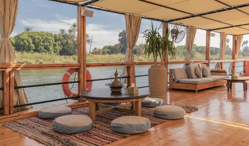 A bordo della Dahabeya Nuun, ogni dettaglio è pensato per offrirti un soggiorno elegante, intimo e rilassante mentre navighi lungo il Nilo. Gli spazi sono progettati per combinare comfort moderno, design raffinato e panorami spettacolari sul fiume.