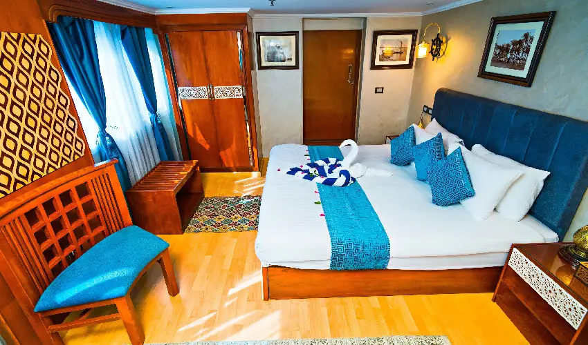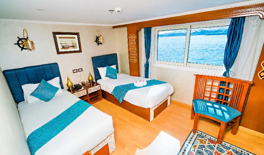 Le cabine accoglienti e luminose offrono grandi finestre panoramiche che regalano viste mozzafiato sul fiume. Sono dotate di letti singoli trasformabili in matrimoniale, bagno privato con doccia, aria condizionata regolabile, cassaforte e prese da 220V, oltre a morbidi asciugamani in cotone egiziano per un tocco di autentico comfort.
