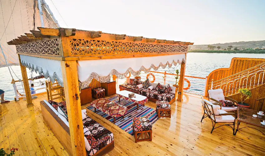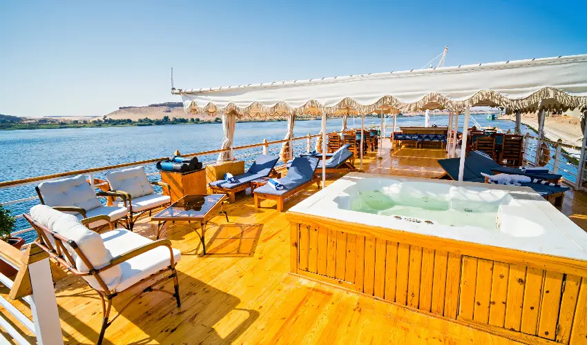 Il ponte superiore è una vera oasi di relax con lettini, jacuzzi panoramica e area lounge in stile orientale, perfetta per ammirare il tramonto sul Nilo.