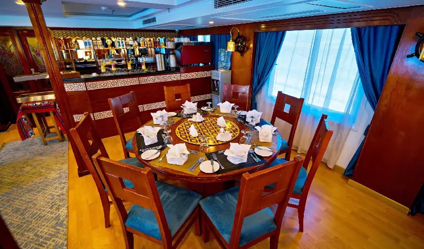 A bordo, il tempo scorre lentamente: rilassati sul sun deck panoramico, assapora la cucina egiziana preparata con ingredienti freschi e lasciati incantare dai tramonti dorati sul Nilo. Grazie alla motobarca di supporto, la navigazione è sempre garantita, assicurando un viaggio fluido e senza interruzioni.