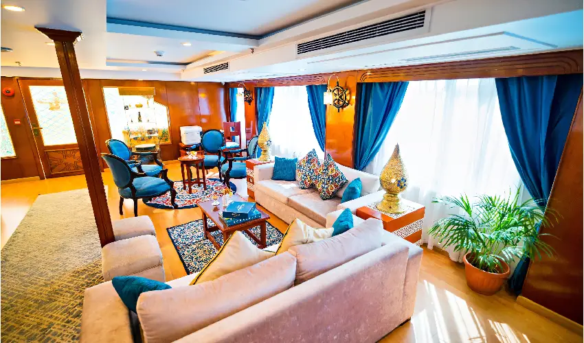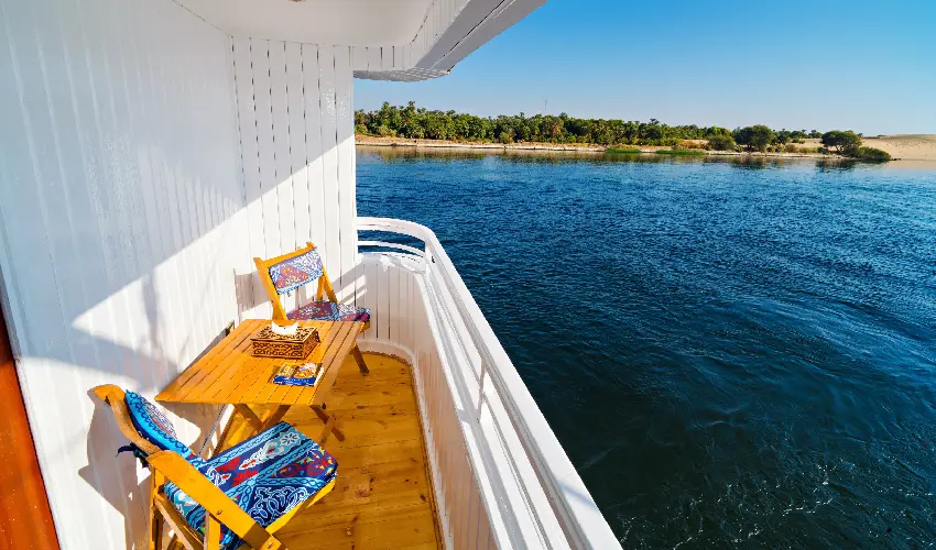 La dahabeya è dotata di alimentazione continua a 220V, sistema di filtraggio dell’acqua, pulizia giornaliera e motobarca di supporto, per garantire navigazione sicura e comfort costante.