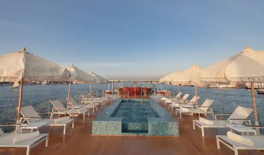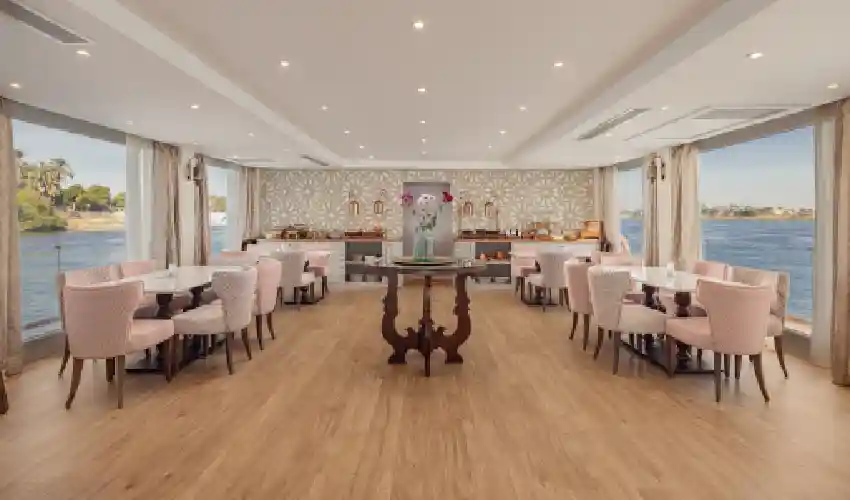 La nave dispone di 10 cabine Deluxe e 2 Suite con Jacuzzi, tutte arredate con grande attenzione ai dettagli e dotate di ogni comfort moderno. Gli ambienti eleganti e accoglienti creano l’atmosfera perfetta per vivere una crociera indimenticabile nel cuore dell’Egitto. Gli spazi comuni includono raffinati ristoranti e lounge, sia interni che all’aperto, dove potrai gustare piatti deliziosi mentre il Nilo scorre placidamente accanto alla tua nave.