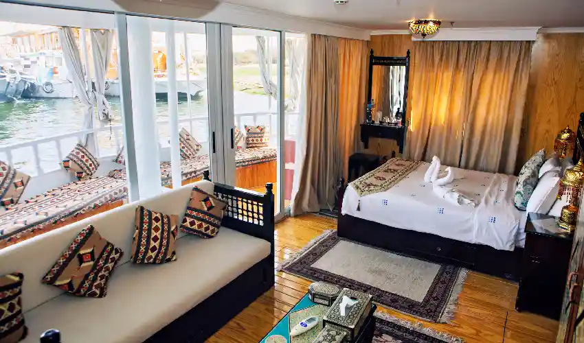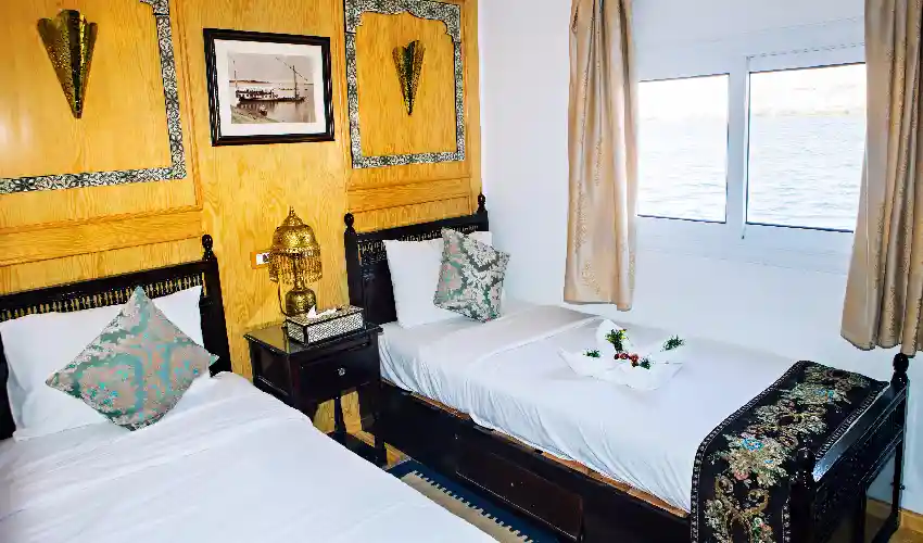 Lasciati accogliere da una delle otto cabine doppie della Dahabeya Amoura, ognuna progettata per offrirti comfort, stile e una splendida vista sul Nilo. Con i loro 13 m² ben distribuiti e le grandi finestre panoramiche, queste cabine regalano un’atmosfera intima e rilassante, perfetta per vivere la magia della crociera in totale tranquillità.