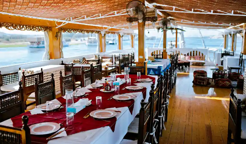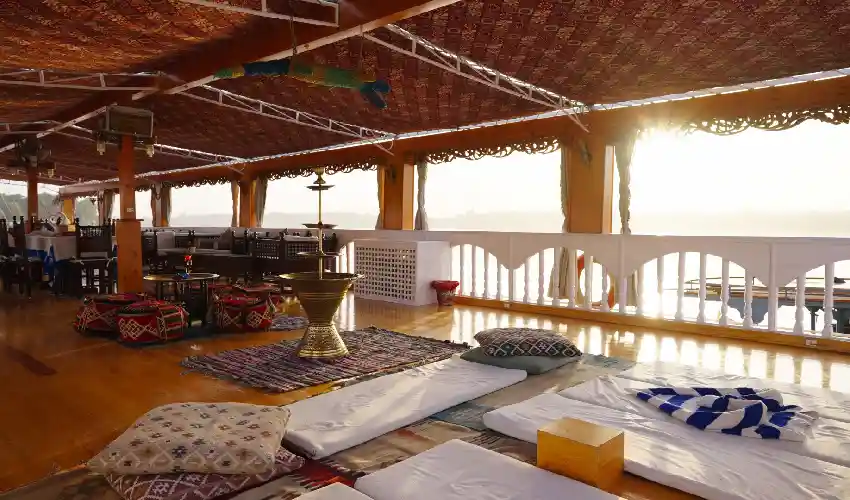Dopo la visita, tornerai a bordo per un pomeriggio all’insegna del relax. Concediti un pranzo fresco e preparato con cura, poi accomodati sul sundeck con una bevanda rinfrescante mentre il paesaggio scorre lentamente verso Aswan. Il tramonto sul Nilo renderà questo momento semplicemente indimenticabile durante la tua Dahabeya Luxor Aswan.
